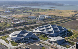 The 42-acre site comprises two office buildings, an event center accommodating 1,000 occupants, and 240 short-term employee accommodation units, with interiors that the company says reflect its vision for the future of work and its goals of creating a more sustainable environment and community. (The project is expected to achieve a LEED-NC v4 Platinum certification and become the largest facility to attain the International Living Future Institute LBC Water Petal Certification; and it aims to operate on carbon-free energy by 2030.) Toward that end, its sustainability features include:
